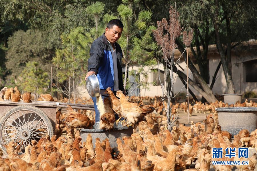 9月20日,在山林中的养殖场内,一名饲养员给鸡喂食。新华社记者 都红刚 摄