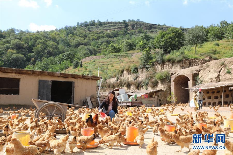 9月20日,张莲莲的儿媳李红卫在养殖场内给鸡喂食。新华社记者 都红刚 摄