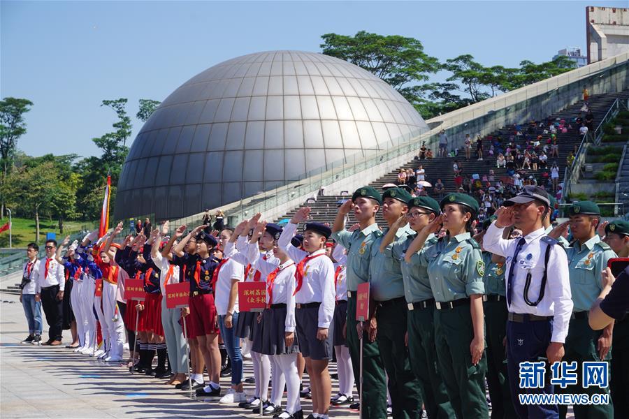 9月21日,深港青少年伴随着国歌向国旗敬礼。 新华社记者 王晓丹 摄