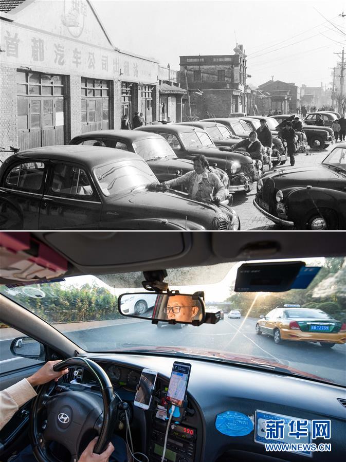 拼版照片:上图为1965年,北京首都汽车公司职工在出租站擦洗汽车(新华社记者郑震孙摄);下图为2019年8月25日,北京新月联合出租汽车公司司机穆怀东一边运送乘客,一边通过网约车手机平台接收订单信息(新华社记者张笑宇摄)。