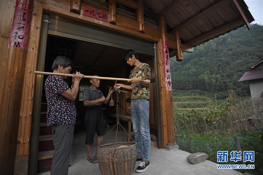 这是“90后”乡村互联网达人“梅山儿郎”张辉(右)在湖南省益阳市安化县东坪镇的农户家收花生(8月22日摄)。曾在长沙打工的张辉今年回到家乡安化创业,和同伴一起成立公司,并在网上取名“梅山儿郎”,通过录制乡村生活短视频推介家乡、销售农产品。目前“梅山儿郎”张辉拥有1.8万“粉丝”,正处于创业初步阶段。 新华社记者李尕摄