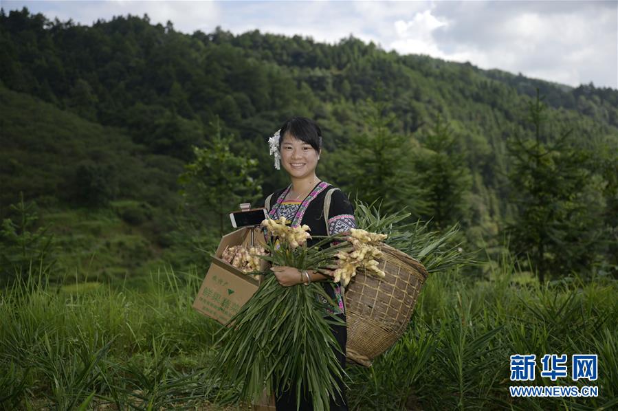 这是乡村互联网达人“乡野丫头”石秋实在湖南省怀化市通道侗族自治县陇城镇的一片姜地里(8月28日摄)。石秋实在通道侗族自治县一所乡村小学工作,两年前她取名“乡野丫头”录制侗族琵琶歌视频在网上一播而红,从此,她开始利用业余时间录视频、做直播在网上推介家乡。今年丰收节前,拥有220多万粉丝的“乡野丫头”石秋实帮乡亲们在网上卖出2000多件小黄姜。 新华社记者李尕摄