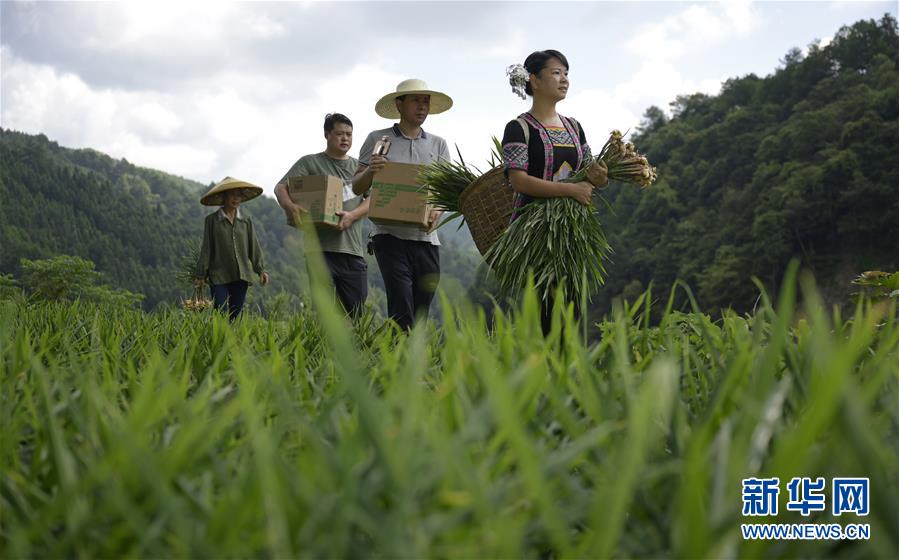 这是乡村互联网达人“乡野丫头”石秋实(右一)在湖南省怀化市通道侗族自治县陇城镇的一片姜地里采姜收货(8月28日摄) 。石秋实在通道侗族自治县一所乡村小学工作,两年前她取名“乡野丫头”录制侗族琵琶歌视频在网上一播而红,从此,她开始利用业余时间录视频、做直播在网上推介家乡。今年丰收节前,拥有220多万粉丝的“乡野丫头”石秋实帮乡亲们在网上卖出2000多件小黄姜。 新华社记者李尕摄