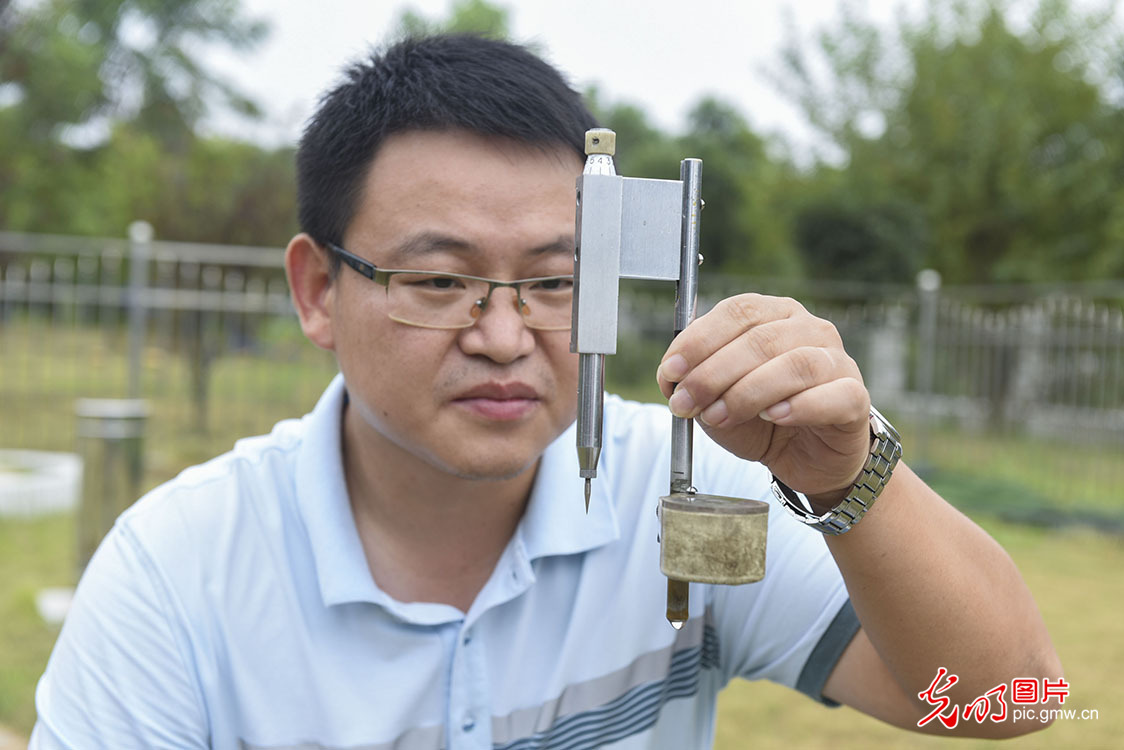 此后,罗兴对自己不断“加码”,白天,罗兴跟着师傅进行实操,只要自己能“上手”的工作,都主动要求“上手”。晚上,总结白天发现的疑问,查找资料,“一开始,师傅们教我安装GPS-RTK测量仪器,当时我自己安装的速度是14分钟,经过反复的请教和练习,我的最好成绩达到了1分26秒。”罗兴说。图为2019年8月28日,罗兴在观测蒸发量。(光明网记者 邵绪楠摄/光明图片)