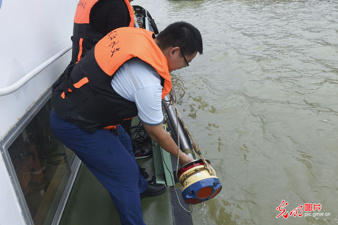 同年,上级单位为螺山站配发了一台进口的Trimble(天宝)GPS罗经,该仪器能够解决ADCP(声学多普勒流速剖面仪)受铁质船体干扰,提高流量测验精度。为了实现仪器早日投产,罗兴和同事又马不停蹄地开展比测。由于该仪器在当时并没有使用前例可循,为了摸索仪器使用方法,罗兴将仪器随带光盘中的英文用户指南,对照着英汉字典,逐字逐句翻译。尽管翻译出来有些生硬,但是使用方法在他脑海中逐渐成型。图为2019年8月28日,罗兴在水文测船上安装声学多普勒剖面流速仪。(光明网记者 邵绪楠摄/光明图片)