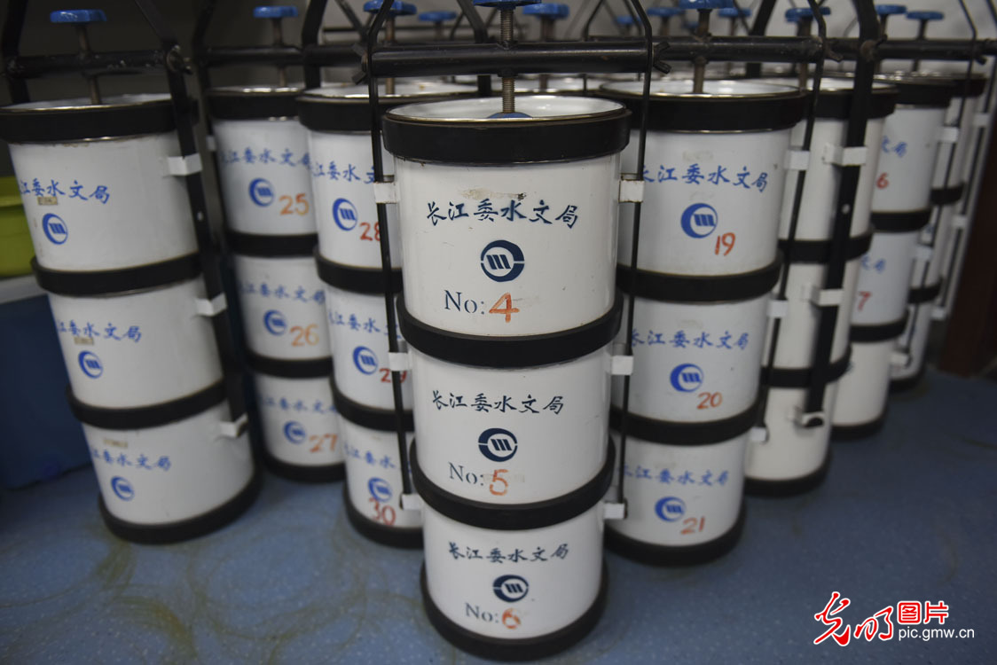 同行的职工已经不抱希望了,但罗兴不愿放弃,他静下心来,脑海里不断回想一个个英文字母,推敲问题出在哪。“那几天甚至半夜也会惊醒,想着是仪器哪儿设置不对,然后一个翻身就从床上起来重新琢磨。”罗兴说。经过几天的反复推敲琢磨,罗兴重新调整了参数设置,并大胆再次进行测试。“26000立方米每秒,30000立方米每秒,40000……”功夫不负有心人,随着一次次比测通过,罗兴终于掌握了该仪器使用方法,解决了高水位期比测误差大的问题,将ADCP流量测验范围从20000立方米每秒拓展至55000立方米每秒,也为后面测站的使用提供了借鉴经验。图为2019年8月27日拍摄的排列整齐的河流悬移质泥沙取样桶。(光明网记者 邵绪楠摄/光明图片)
