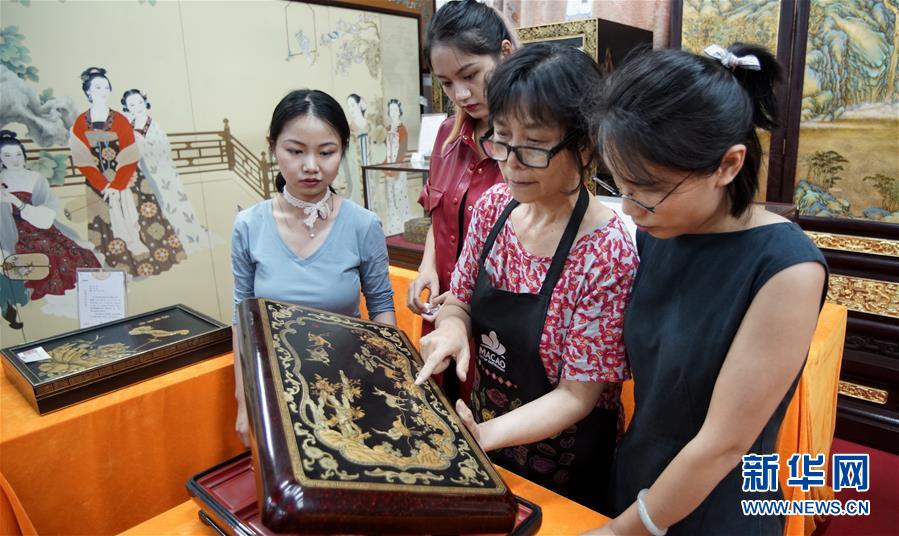 胡昕(右二)在北京金漆镶嵌有限责任公司为学生讲解她创作的金漆镶嵌作品(9月19日摄)。 新华社记者 李欣 摄