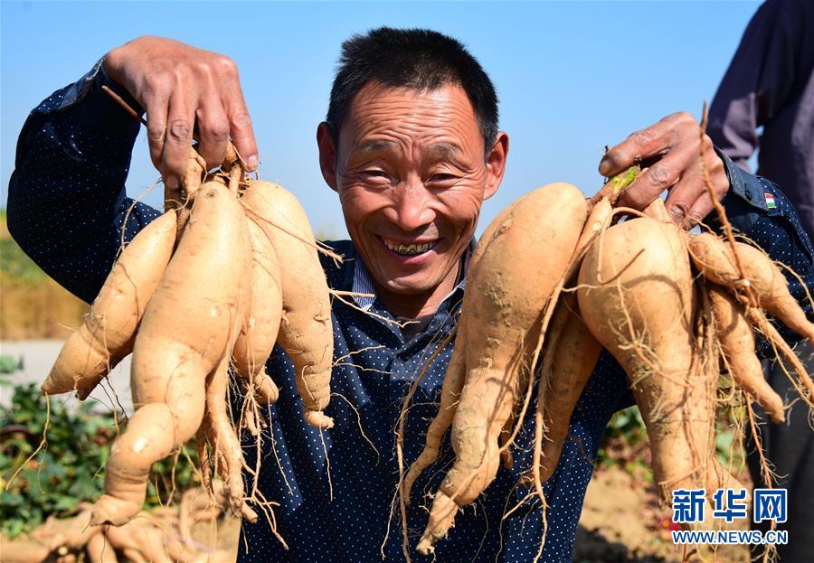 9月22日,山东省枣庄市山亭区店子镇柳泉村农民在展示收获的红薯。 金秋时节,各地一派丰收景象,农民们满怀收获的喜悦,迎接“中国农民丰收节”的到来。 新华社发(刘明祥 摄)