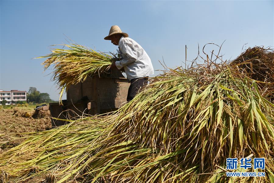 9月22日,湖南省衡东县吴集镇大势塘村村民在收割稻谷。 金秋时节,各地一派丰收景象,农民们满怀收获的喜悦,迎接“中国农民丰收节”的到来。 新华社发(肖亚辉 摄)