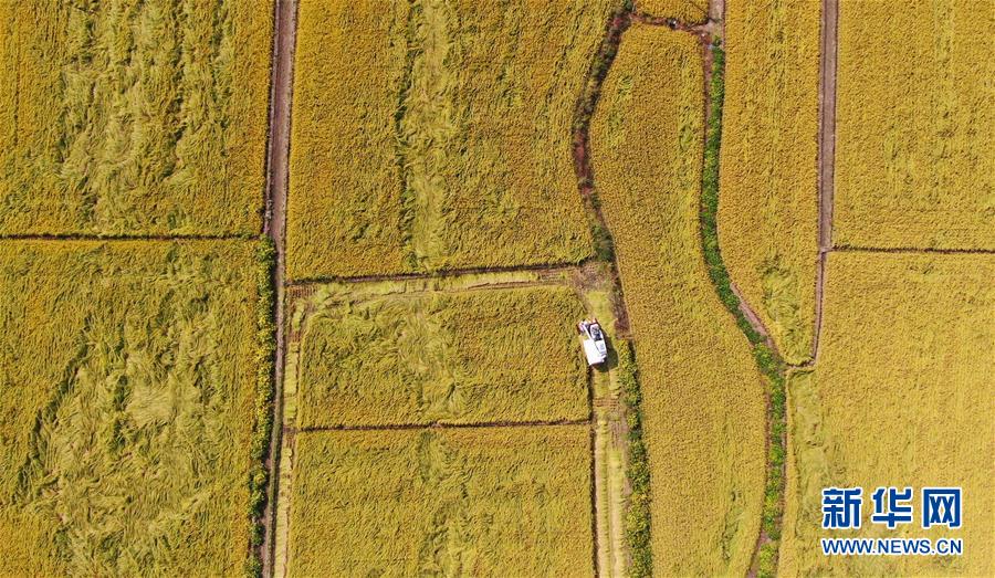 9月20日,在沈阳市沈北新区兴隆台镇张美窝棚村,村民驾驶收割机收割水稻(无人机摄)。 近日,辽宁省沈阳市沈北新区和苏家屯区的水稻陆续成熟,农民们抢抓农时收割稻谷。从空中俯瞰,金黄的稻田与村落相互映衬,美不胜收。 新华社记者 杨青 摄