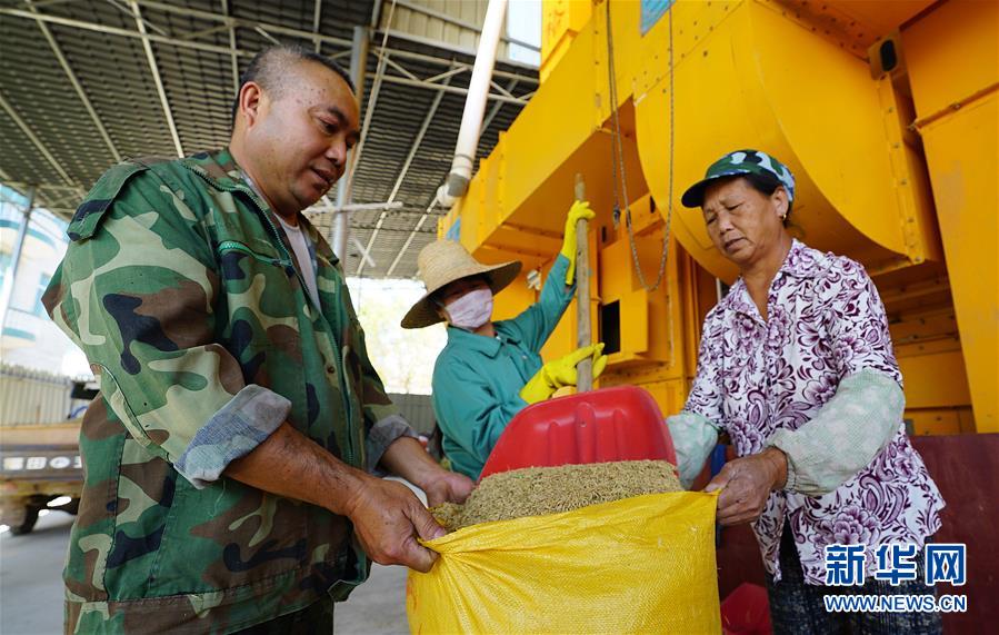 9月23日,在江西省井冈山市坳里乡,文龙才和井冈山市高山红米种植专业合作社的社员对红米稻谷进行烘干。新华社记者 彭昭之 摄
