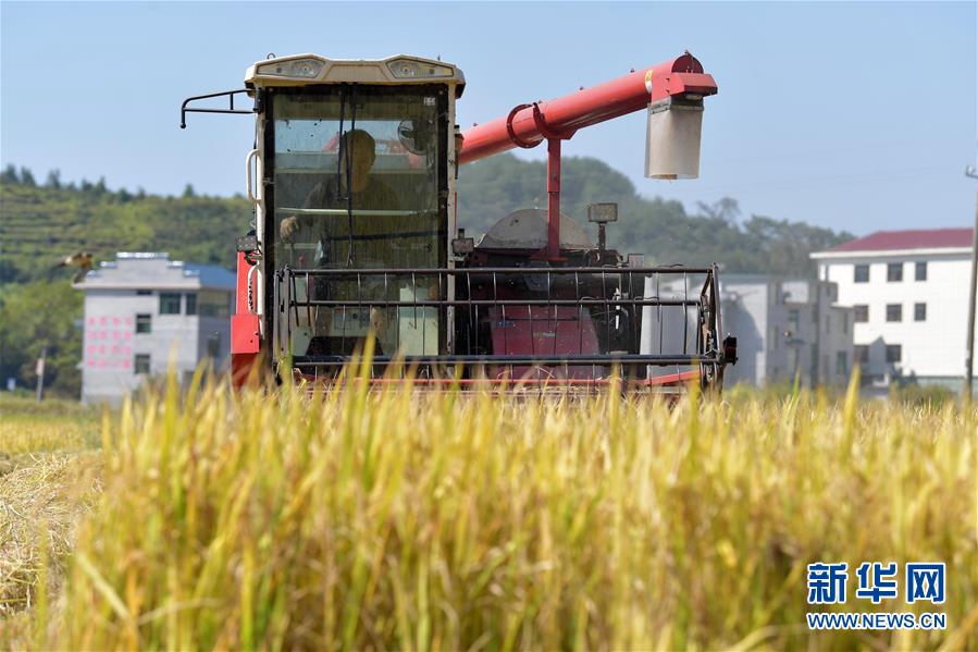 9月23日,在江西省井冈山市坳里乡,井冈山市高山红米种植专业合作社的社员在收割红米稻谷。新华社记者 彭昭之 摄