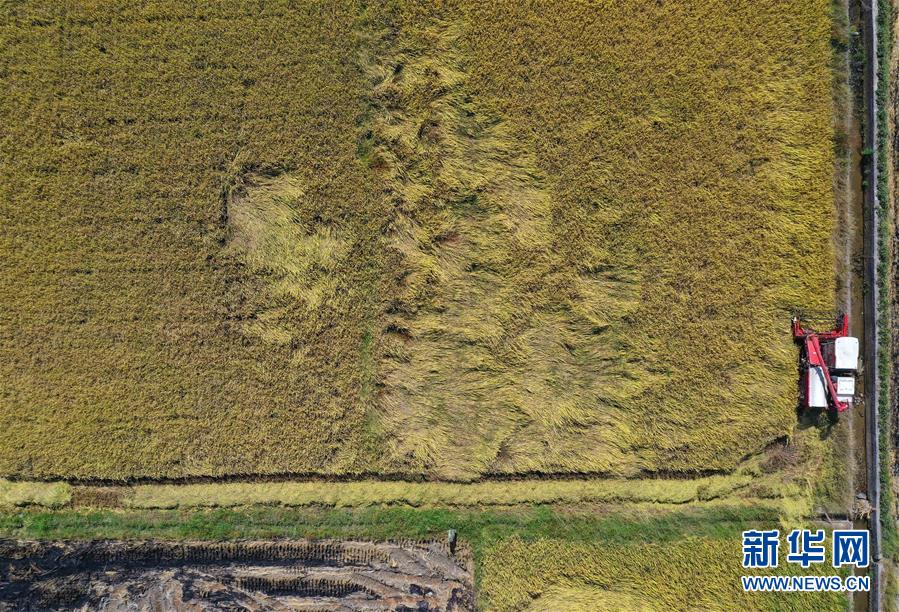 9月23日,在江西省井冈山市坳里乡,文龙才和井冈山市高山红米种植专业合作社的社员在地里收割红米稻谷(无人机拍摄)。新华社记者 彭昭之 摄