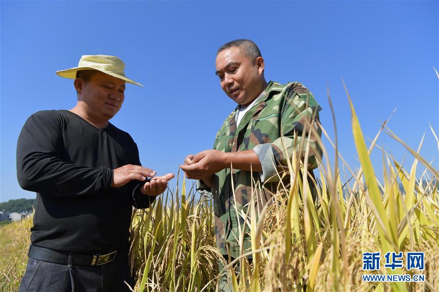 9月23日,在江西省井冈山市坳里乡,文龙才和井冈山市高山红米种植专业合作社的社员在查看井冈红米稻谷的成熟情况。新华社记者 彭昭之 摄