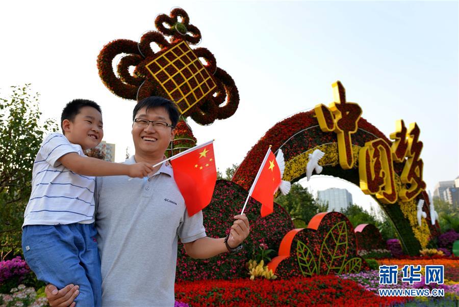 9月23日,市民在“美好明天”花坛前留影。 新华社发(任超 摄)