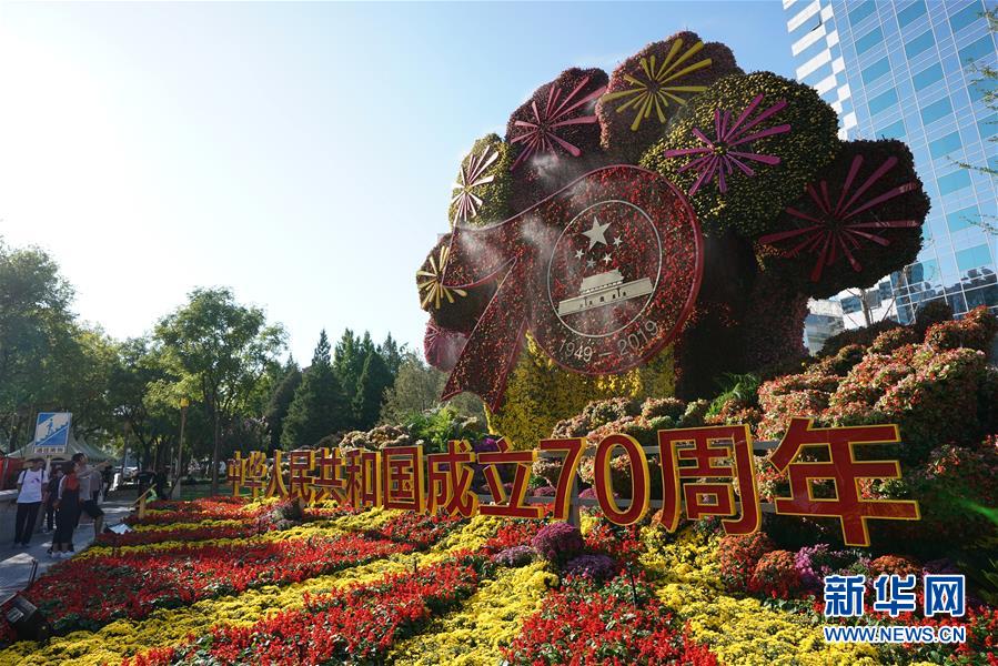 9月23日,市民在建国门西北角观赏“壮丽70年”花坛。 新华社记者鞠焕宗摄