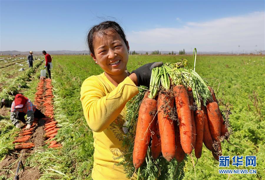 9月24日,张家口市塞北管理区的工人在展示刚收获的胡萝卜。 近日,河北省张家口市塞北管理区马铃薯、胡萝卜进入收获期,工人抢抓农时进行收获。据介绍,塞北管理区今年播种马铃薯近6万亩、胡萝卜1万余亩,预计两种作物产量达27万吨。 新华社记者 杨世尧 摄