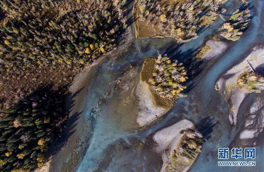 9月25日无人机拍摄的喀纳斯景区风光。 金秋时节,位于新疆阿勒泰地区的喀纳斯景区内的林木与喀纳斯湖相互映衬,美不胜收。 新华社记者 王菲 摄