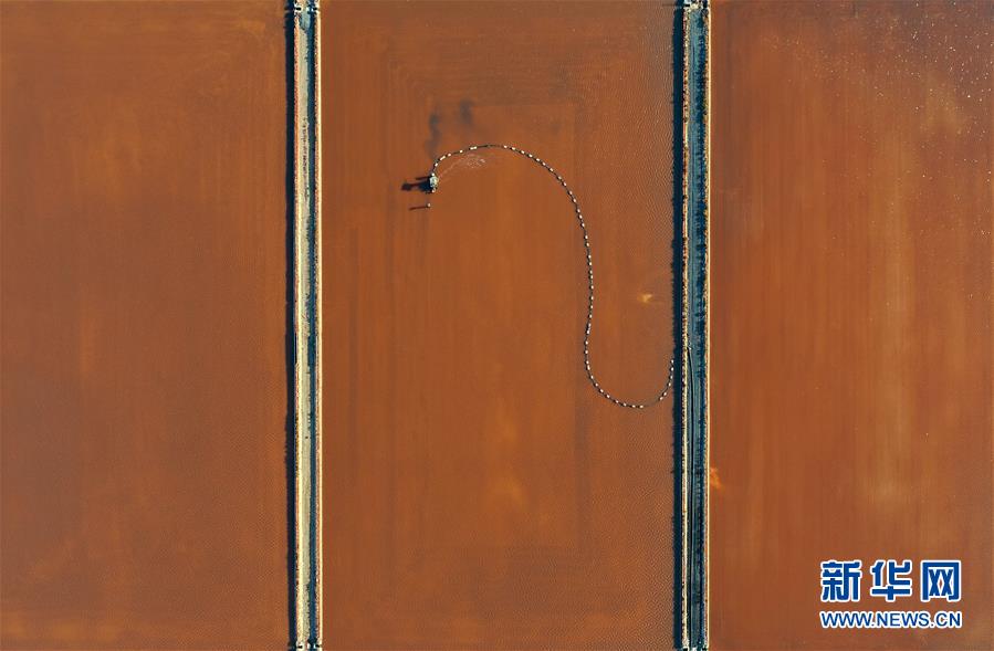 9月24日,唐山海港经济开发区大清河盐场的工人在操作机械设备收获秋盐(无人机拍摄)。 近日,长芦盐区河北唐山海港经济开发区大清河盐场的秋扒工作全面展开,今年预计海盐总产量将达55万吨。 新华社记者 杨世尧 摄