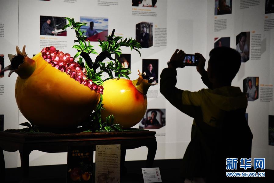 9月25日,观众在参观拍摄展出的展品。 当日,“壮丽70载,奋斗新时代——中国·山东工艺美术大师精品展”在山东博物馆开幕,共展出70位工艺美术大师的120余件作品。 新华社记者 王凯 摄
