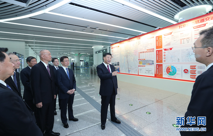 9月25日上午,北京大兴国际机场投运仪式在北京举行。中共中央总书记、国家主席、中央军委主席习近平出席仪式,宣布机场正式投运并巡览航站楼。这是习近平在轨道交通大兴机场线草桥站进站大厅,结合展板听取情况介绍。 新华社记者 鞠鹏 摄