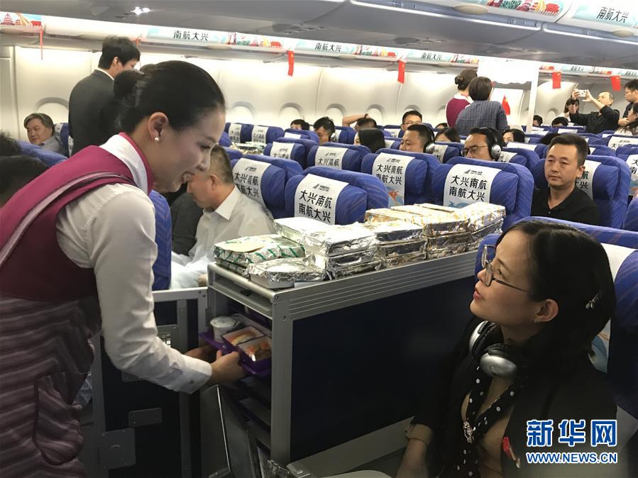 9月25日,在南航CZ3001次航班上,空乘人员为旅客发放航食。 当日16时20分许,北京大兴国际机场首航班机——南航CZ3001次航班起飞前往广州。 新华社记者 邰思聪 摄