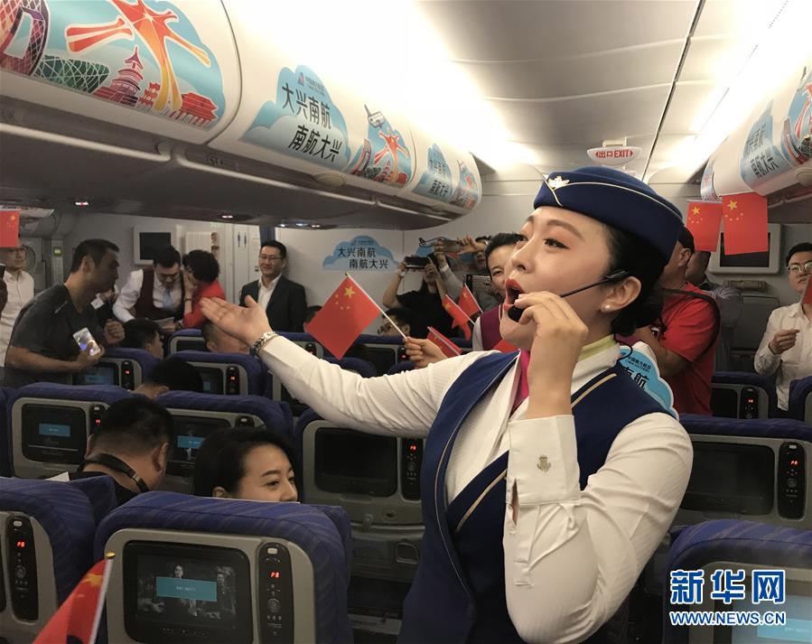 9月25日,在南航CZ3001次航班上,空乘人员为乘客演唱歌曲《我和我的祖国》。 当日16时20分许,北京大兴国际机场首航班机——南航CZ3001次航班起飞前往广州。 新华社记者 邰思聪 摄