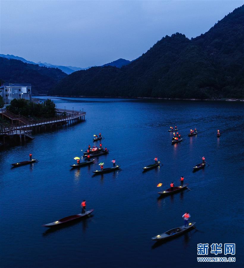 9月25日,在宋村乡云源港的水面上,渔民划着渔船,船头点亮渔灯,构成一幅“渔舟唱晚、万家灯火”的美丽图景(无人机拍摄)。 近年来,浙江省杭州市淳安县宋村乡积极发展乡村旅游,打造渔家元素特色景观,助力乡村振兴建设。目前,宋村乡依托山水景观和渔家文化,带动了当地精品民宿和集沙滩嬉水、自助烧烤、农事体验、民俗摄影采风为一体的特色旅游发展。2019年1月初至7月底,全乡接待游客10万人次,实现旅游经济收入1300万元。 新华社记者 徐昱 摄