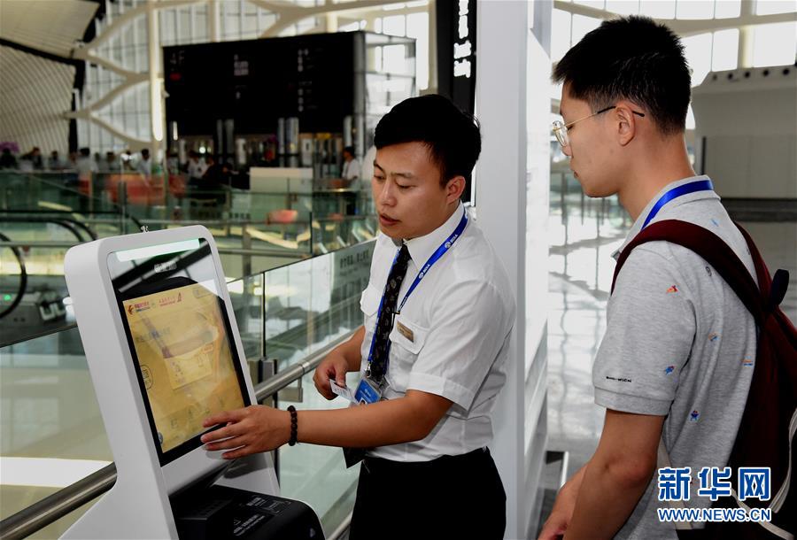 工作人员(左)在向记者介绍自助办理登机手续(9月10日摄)。 新华社发(任超摄)