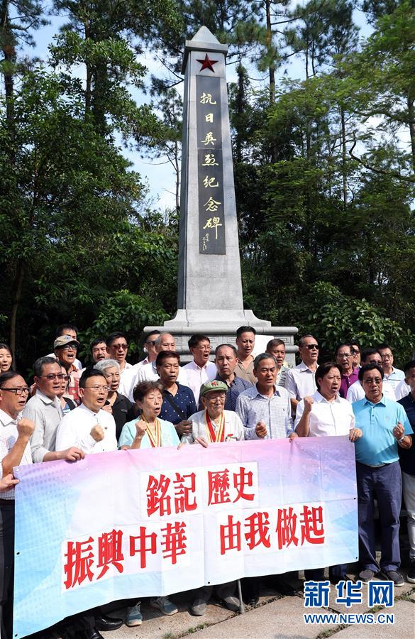 在香港乌蛟腾抗日烈士纪念碑前,数十名香港市民集会表达对暴徒破坏、污损烈士纪念园的强烈愤慨与谴责(9月18日摄)。新华社记者 罗欢欢 摄