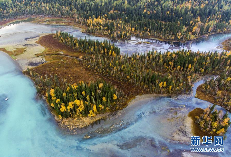 9月24日无人机拍摄的喀纳斯景区风光。 金秋时节,位于新疆阿勒泰地区的喀纳斯景区内的林木与喀纳斯湖相互映衬,美不胜收。 新华社记者 王菲 摄