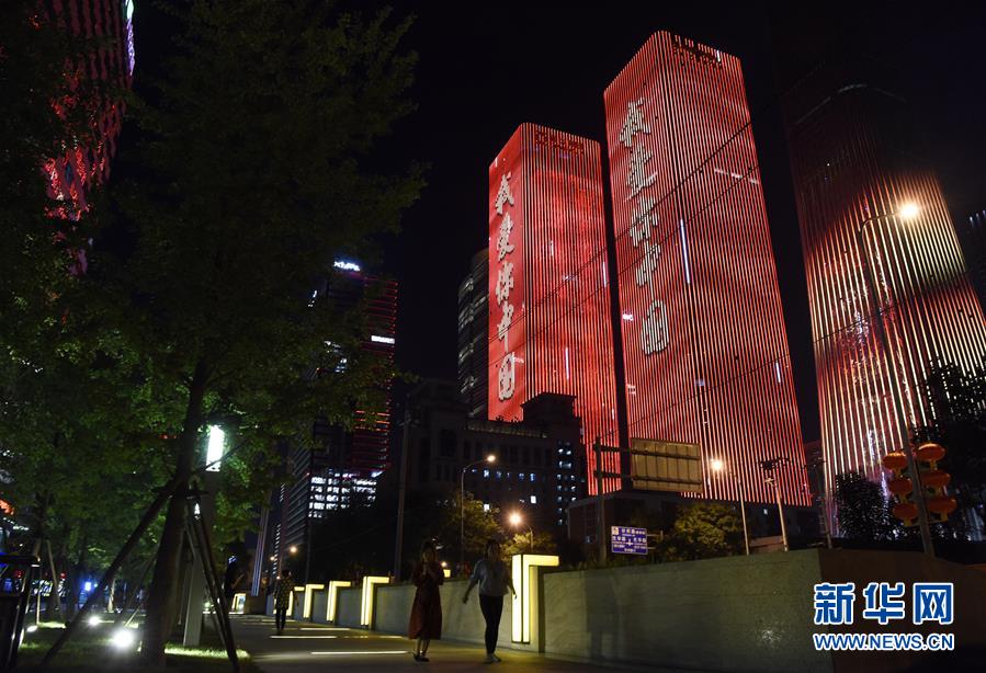 9月25日,北京CBD地区高层建筑亮起彩灯,迎接新中国成立70周年。 新华社记者 武巍 摄