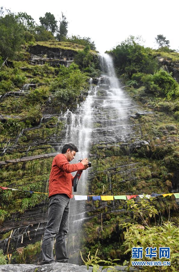 9月25日,游客在勒布沟的瀑布前拍照。
