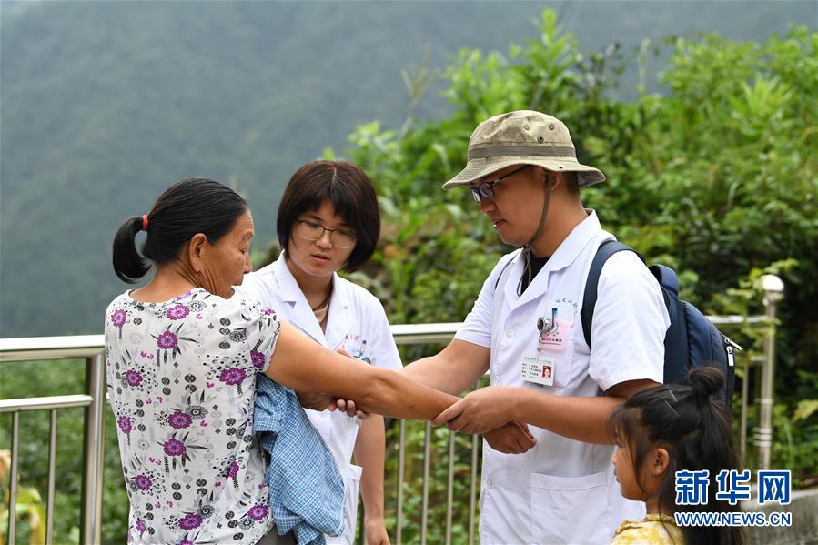 在位于安徽省休宁县与浙江省淳安县交界处的深山里,驻村医生徐晓婵(左二)和张建明夫妇在璜尖乡清溪村为村民开展医疗服务,女儿张清语陪伴在旁(2019年8月31日摄)。徐晓婵、张建明分别是安徽中医药大学第二附属医院和安徽医科大学第二附属医院的医生。夫妻俩一起报名参加了安徽省“健康脱贫 百医驻村”行动,承担起清溪村和徐家村两个偏远山村约700名常住居民的医疗保健和公共卫生服务。他们的女儿张清语也转学来到黄山市休宁县璜尖中心小学,同父母一起开始了为期两年的“驻村”生活。 新华社记者刘军喜摄