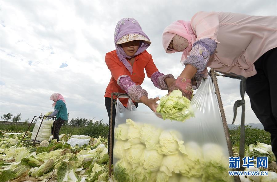在宁夏固原市原州区彭堡镇姚磨村,村民在田间收割娃娃菜(2016年8月11日摄)。该村地处“苦瘠甲天下”的宁夏南部山区,是全区68个贫困村之一,以发展冷凉蔬菜种植产业为主要脱贫手段,成为固原市整村推进、整村脱贫的典范。 新华社记者 彭昭之 摄