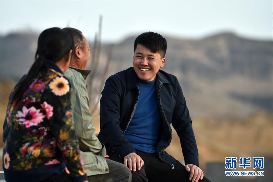 在山西省永和县奇奇里村,驻村第一书记郭若桥(右)和村民拉家常(2019年4月1日摄)。2017年,这个昔日既穷又偏的贫困村实现脱贫摘帽。 新华社记者 詹彦 摄