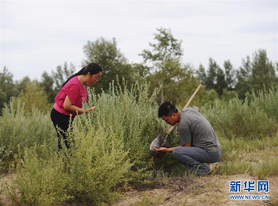 在科尔沁沙地深处的内蒙古通辽市奈曼旗白音他拉苏木包头嘎查,蒙古族妇女宝秀兰和丈夫在查看黄柳下面的沙土情况(2013年8月7日摄)。被授予全国防沙治沙标兵称号的宝秀兰,20年来植树30余万株,不仅把自家承包的2500亩荒沙变成了绿洲,还带领村民治理沙漠6万多亩,使嘎查的风沙危害得到有效控制,被当地农牧民誉为“治沙女愚公”。 新华社记者 燕雁 摄