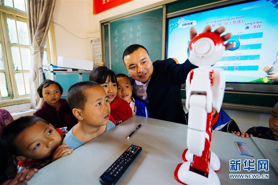 在湖南省花垣县十八洞小学,老师吴忠碧在课间给学生展示智能机器人(2017年11月8日摄)。乡村教师吴忠碧肩负起前辈苗族老人施贵海教书育人的责任,留在贫困山区里执教。随着十八洞村实现整村脱贫,学校校舍得到改扩建,多媒体课堂等丰富的现代化教学手段也进入了这所大山里的学校。 新华社记者 刘金海 摄