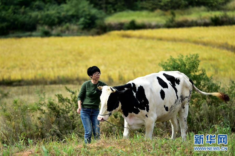 “80后”邢翠翠在放牛(2016年10月11日摄)。上海姑娘邢翠翠2009年来到位于大别山深处的国家级贫困县安徽岳西县黄铺镇鲍岭村,白手起家开始创业,成立畜禽养殖专业合作社,以“公司+农户”的模式,为周边贫困农户提供兔种、养殖技术、牧草种子和饲料、疫苗等,并负责回收商品兔,让很多贫困村民实现脱贫。 新华社记者 刘军喜 摄