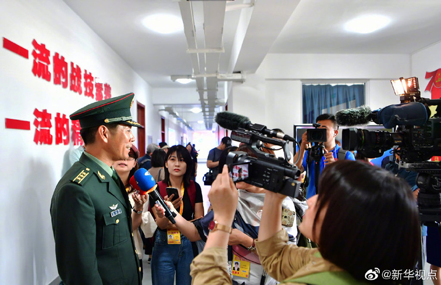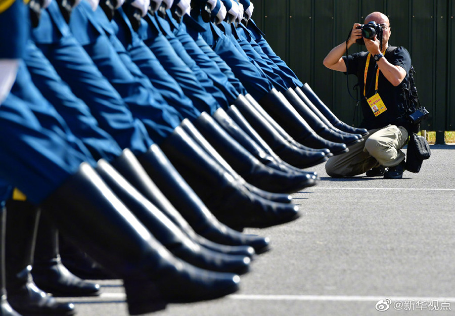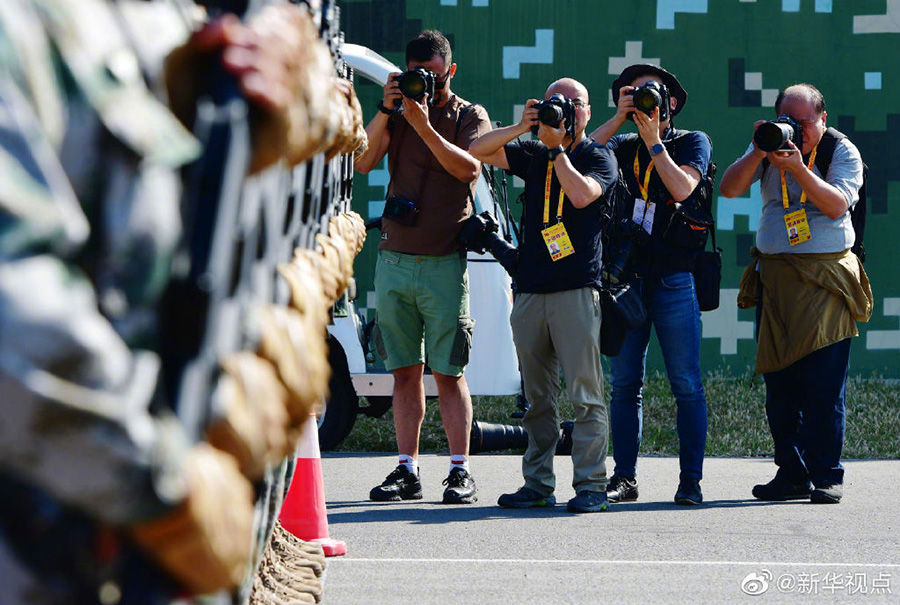 观摩徒步方队和联合军乐团训练,参观阅兵部队宿舍,与仪仗方队和维和部队方队官兵对话……阅兵集训点有啥故事?快来跟着中外记者一探究竟⬇(新华社记者 魏培全 摄)