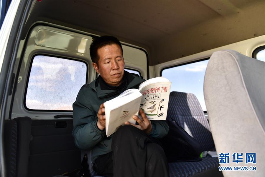 9月25日,青海湖国家级自然保护区管理局的巡湖观测人员王延明在巡湖间隙阅读中国鸟类野外手册。