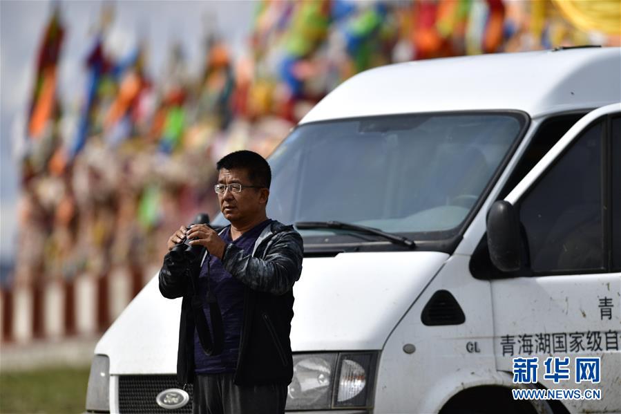 9月23日,青海湖国家级自然保护区管理局的巡湖观测人员杨涛在青海湖畔的尕日拉村观测点进行观测。