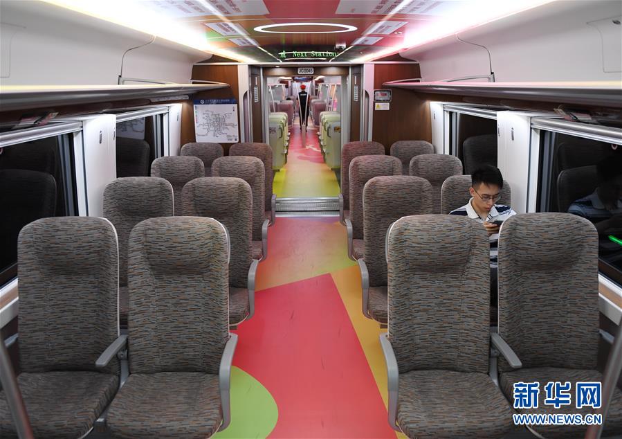9月26日拍摄的轨道交通大兴国际机场线车辆内部。 当日,北京轨道交通大兴国际机场线开通试运营,位于大兴国际机场线草桥站的城市航站楼同步启用,旅客在草桥站可享受到值机和行李托运服务,轻松前往机场。 新华社记者 张晨霖 摄