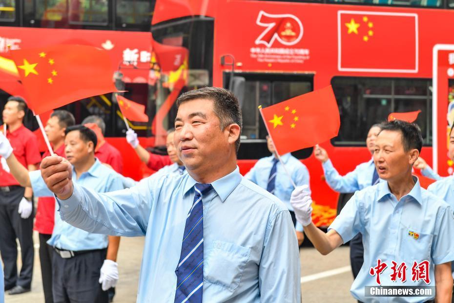 9月26日,广州的公交车、出租车司机代表在珠江帝景苑公交总站内手持国旗合唱《我和我的祖国》。当日,广州市文明办、广州市交通运输局、广州公交集团共同举办的“我和国旗同框——广州市公交车出租车万车挂国旗‘迎国庆’”活动启动。中新社记者 陈骥旻 摄