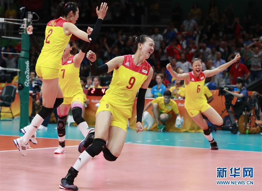 这是2016年8月20日,在巴西里约奥运会女子排球决赛中,中国队球员庆祝夺冠。 新华社记者任正来摄