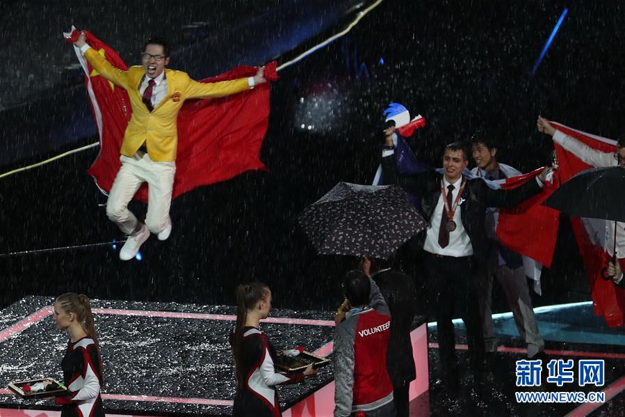 这是2019年8月27日,在俄罗斯喀山举行的第45届世界技能大赛上,中国选手徐澳门(左一)在颁奖典礼上身披国旗跳起庆祝。徐澳门获得第45届世界技能大赛车身修理项目金牌。 新华社记者鲁金博摄