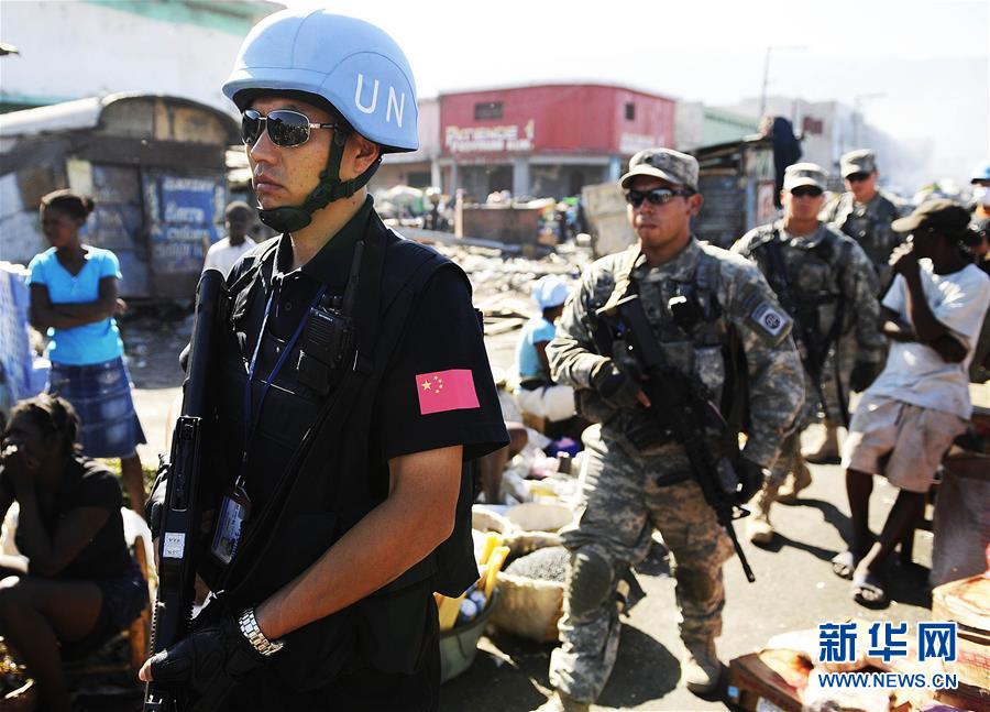 这是2010年1月28日,在海地首都太子港,受联合国驻海地稳定特派团(联海团)指派,一名中国赴海地维和警察防暴队队员(前)与美军士兵在街头巡逻。 新华社记者吴晓凌摄