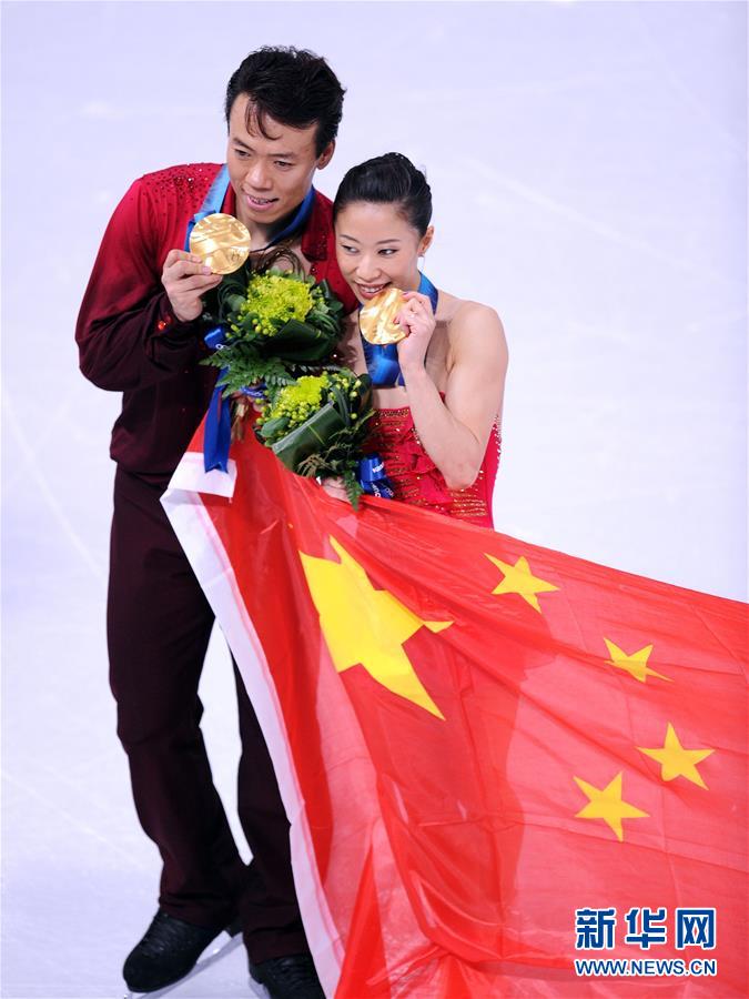 这是2010年2月15日,在加拿大温哥华冬奥会上,中国选手申雪(右)和赵宏博在花样滑冰双人滑比赛夺冠后手拿国旗庆祝。 新华社记者武巍摄