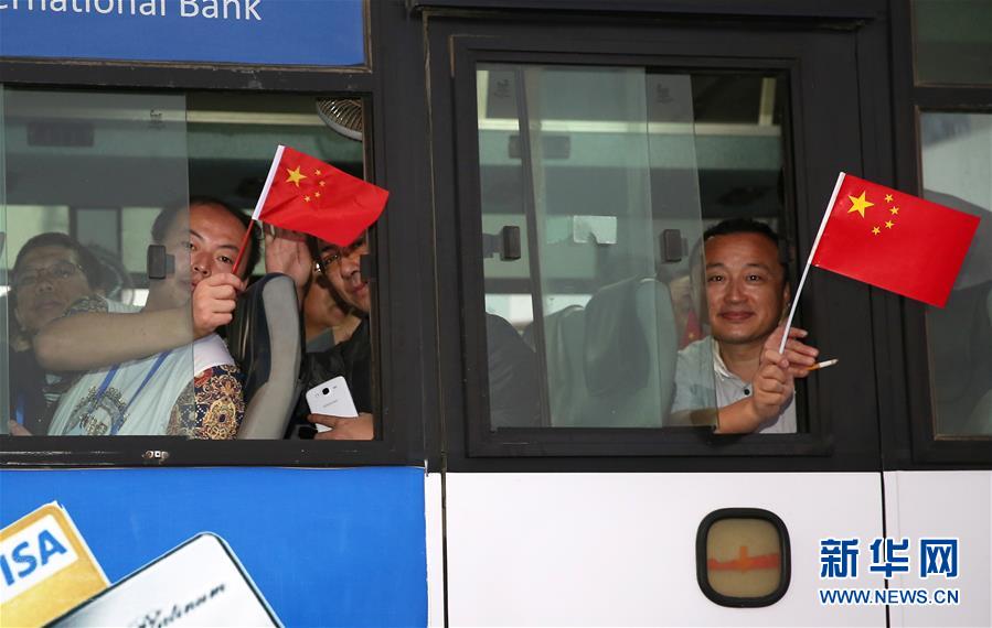 这是2015年3月31日,在吉布提首都吉布提市,从也门撤离的中国公民在大巴上挥舞国旗。当日,第二批撤离也门的中国公民乘坐中国海军护航编队护卫舰潍坊舰平安抵达吉布提港。 新华社记者潘思危摄
