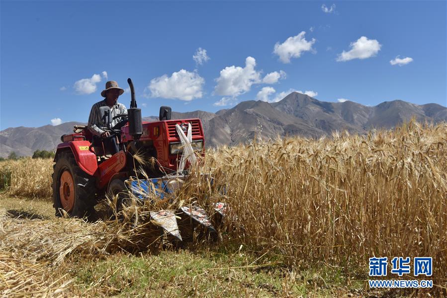 在西藏日喀则市江孜县紫金乡努堆村,村民驾驶收割机收青稞(9月26日摄)。 日喀则市江孜县是西藏青稞主产区之一。眼下正值青稞收获季节,当地农民抓紧收割,农田里一片繁忙景象。 新华社记者 周锦帅 摄